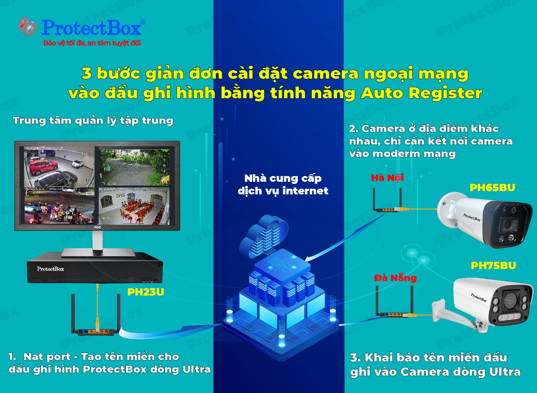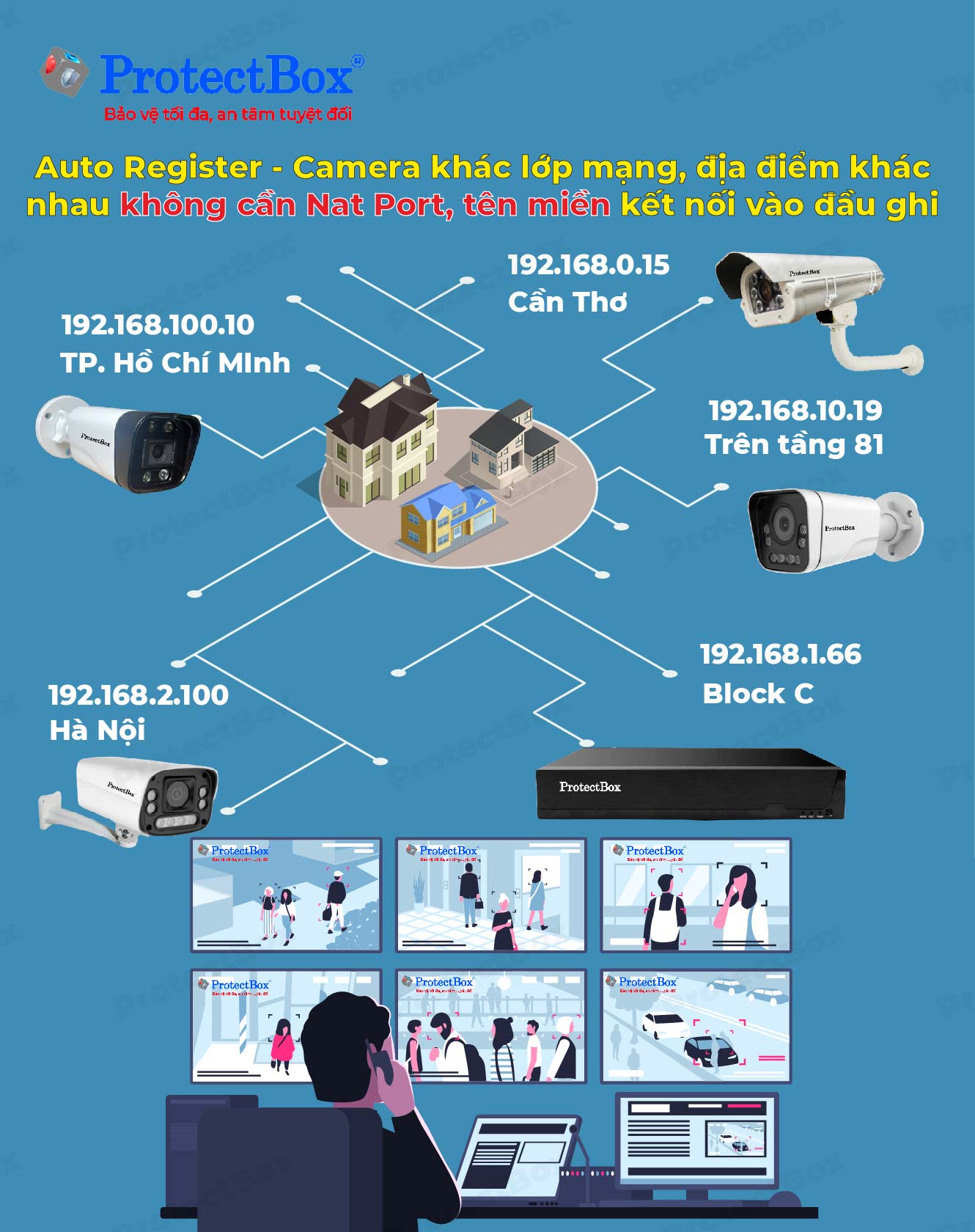 Camera có các lớp mạng khác nhau, ở địa điểm khác nhau, nhờ tính năng Auto Register nên không cần tên miền, Nat Port vẫn kết nối đầu ghi dễ dàng, ổn định.