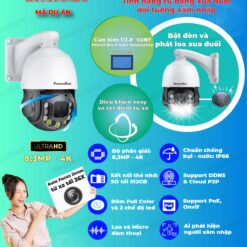 Kết nối mạng: RJ45 có dây. Quan sát: Ngày – Đêm / Trong nhà/ Ngoài trời – IP66, phù hợp khu vực có không gian rộng lớn