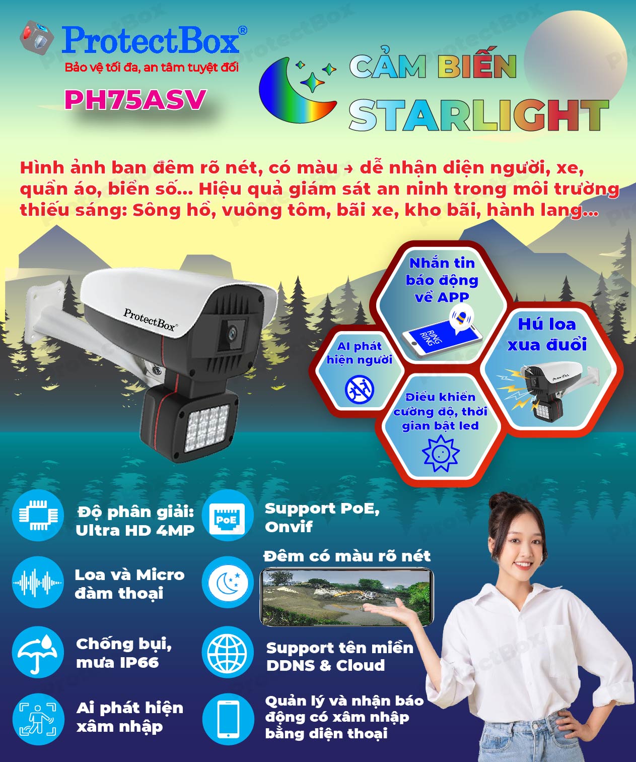 Camera IP Starlight đêm có màu rõ đẹp, ngoài trời 4MP ProtectBox PH75ASV