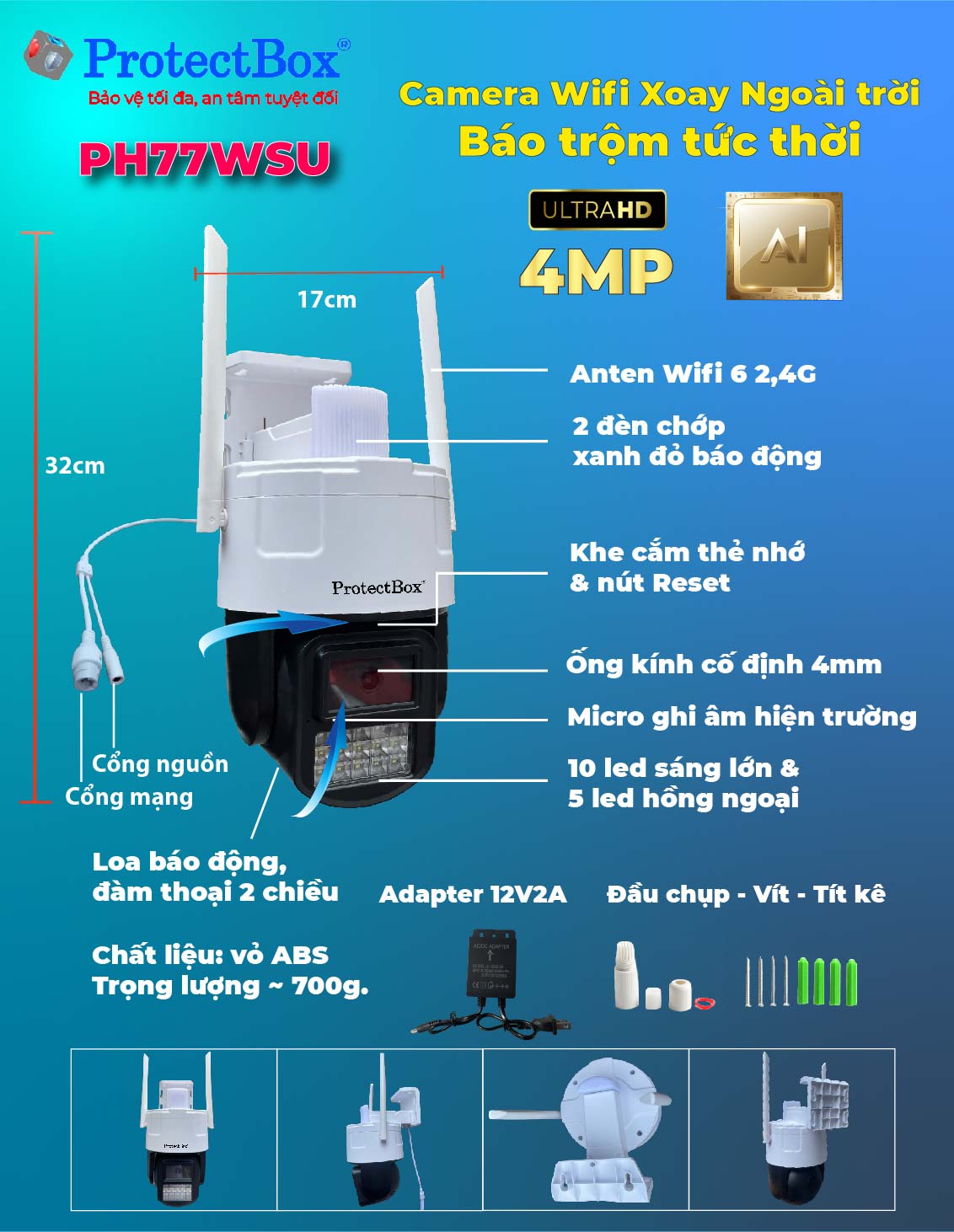 Camera IP Wifi Báo trộm 4MP Cảm biến Starlight Ngoài trời ProtectBox PH77WSU