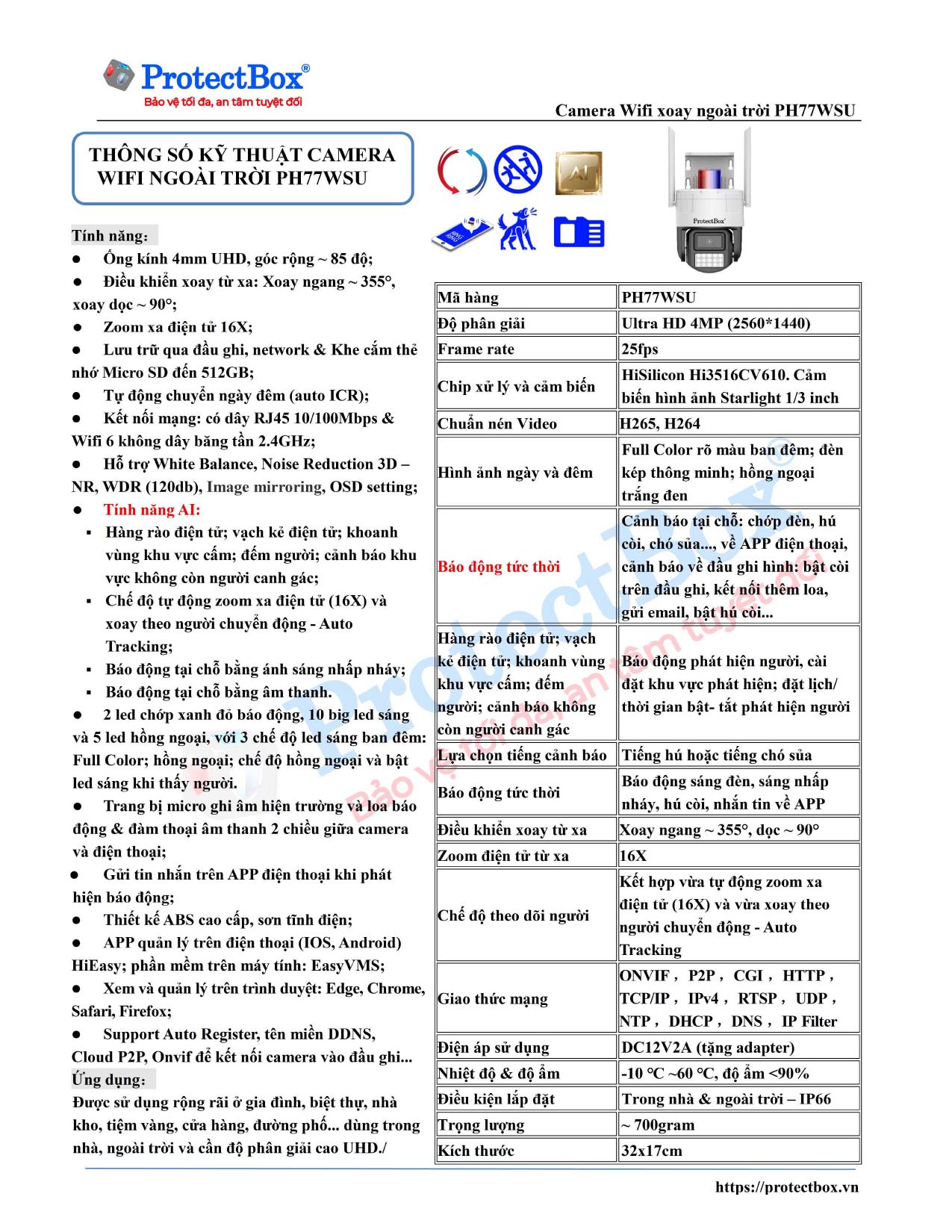 Thông số kỹ thuật Camera PH77WSU: