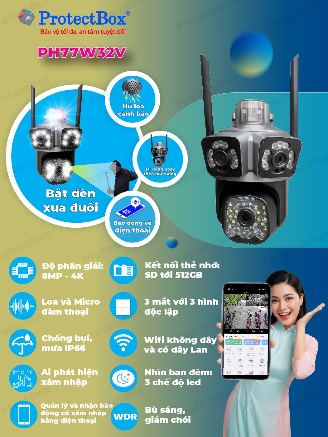 Camera Wifi ngoài trời 3 mắt 8MP ProtectBox PH77W32V