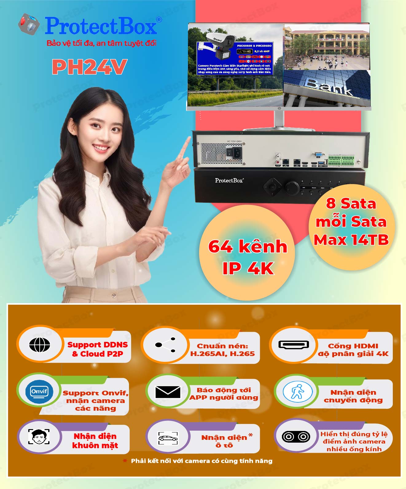 Đầu ghi hình 64 kênh IP 4K 8 Sata ProtectBox PH24V