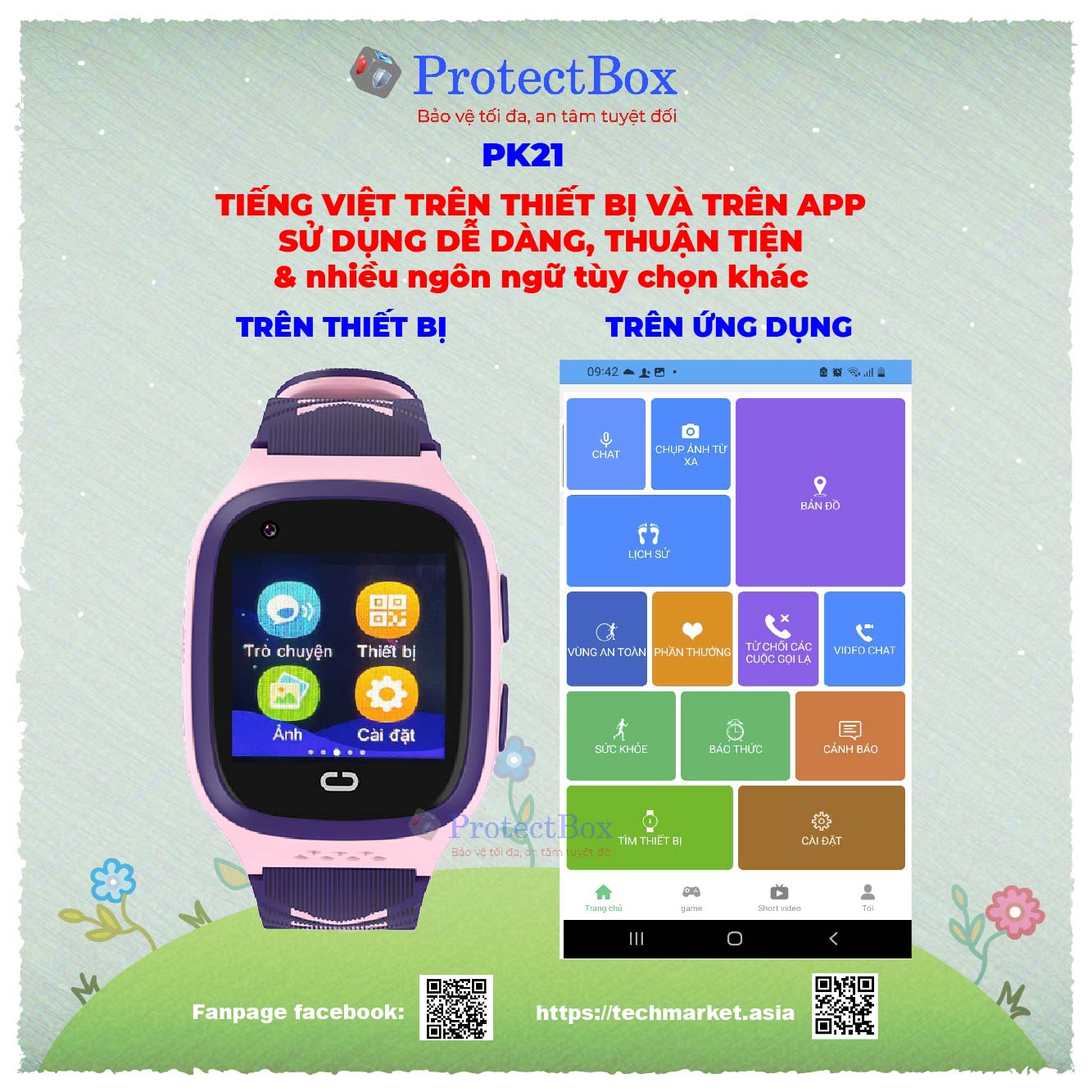 – Tiếng Việt được sử dụng trên thiết bị PK 21 và trên App quản lý của ba mẹ; Ngoài ra còn hỗ trợ nhiều ngôn ngữ khác: Tiếng Anh, tiếng Hoa…;