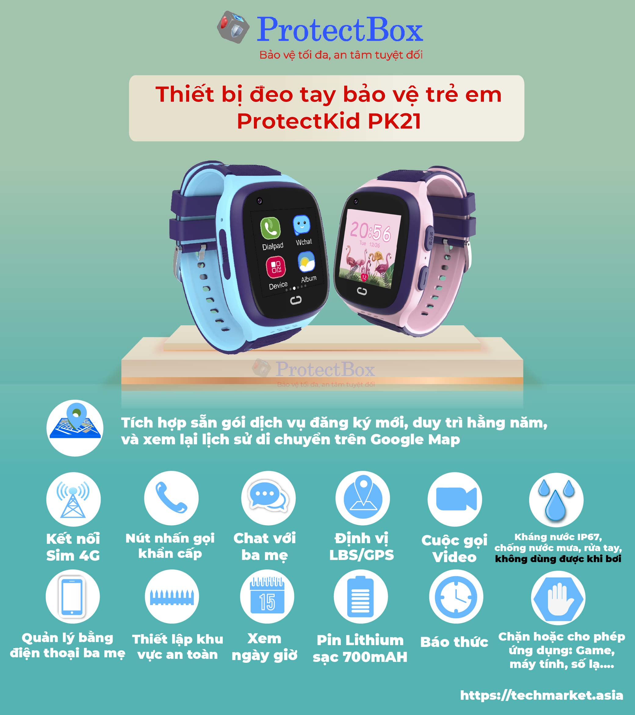 Tính năng tóm lược: đeo tay, dùng sim 4G, báo động khẩn cấp SOS, nghe gọi bằng Video Call, định vị GPS & LPS, xem và lưu trữ hành trình trên bản đồ số của Google Map; Không được truy cập internet; Voice chat, chống mưa, ba mẹ quản lý thiết bị từ xa bằng điện thoại, nhắn tin báo động khi ra khỏi khu vực thiết lập, dung lượng pin lớn 700mAH, chặn hoặc cho phép ứng dụng hoạt động: Game, máy tính, số lạ…